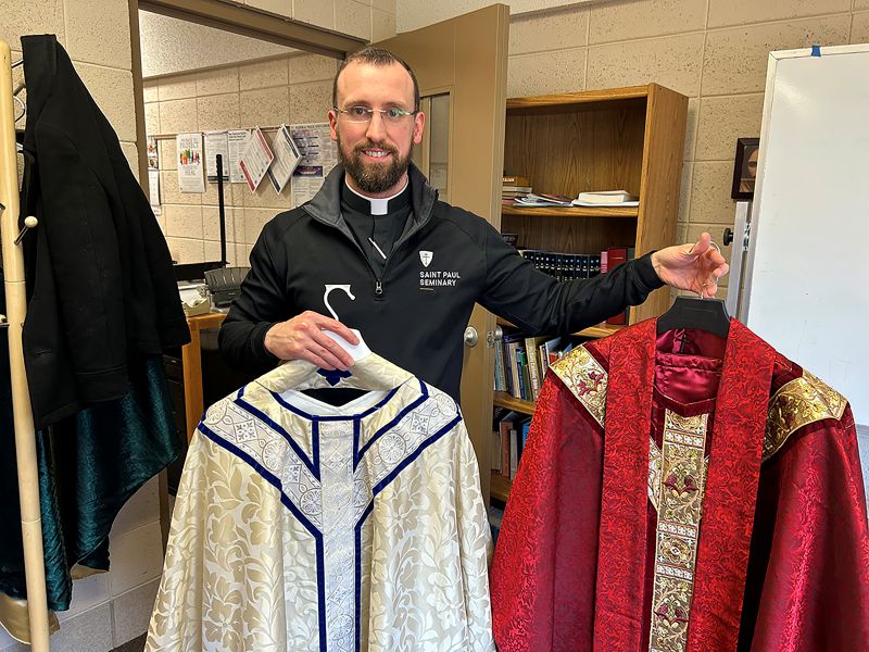 After working at a courthouse and for a personal injury law firm, he decided to attend IHM Seminary in Winona to get a degree in philosophy. The next step was a year at Sacred Heart in Detroit to earn a Master’s in Divinity. The final stop was at St. Paul’s in the Twin Cities to become a priest.