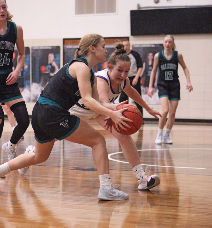 Grand Meadow’s Rylee Schaufler and Fillmore Central’s Aubrey Daniels fight for a loose ball in the teams’ non-conference affair. GM posted three wins on the week, over Southland 58-36, LeRoy-Ostrander 66-35, and the Falcons 44-37. The Larks improved to 11-2. Photo by Paul Trende