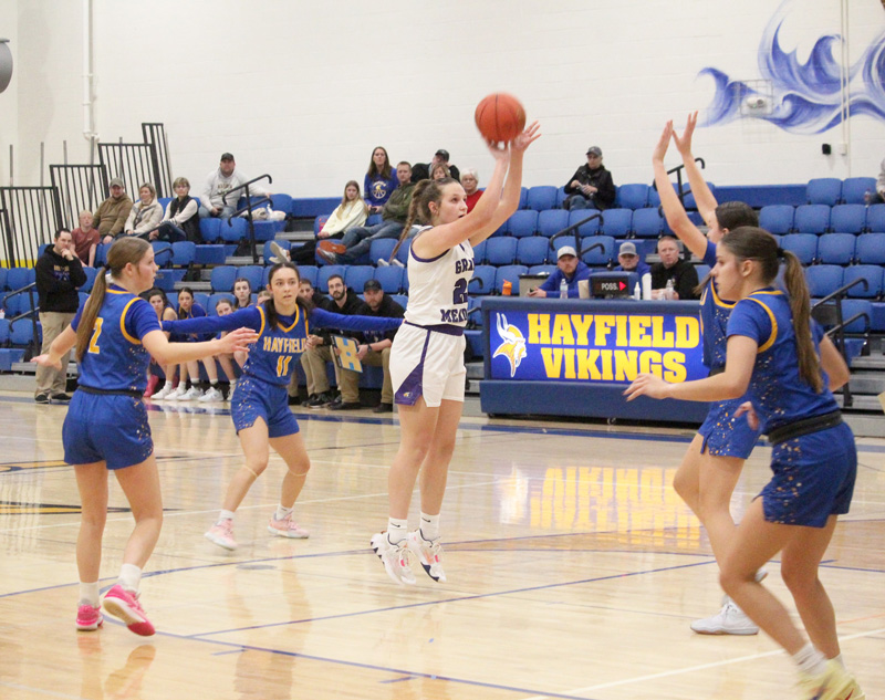 They are currently on the longest win streak of the 21 basketball teams covered by the Fillmore County Journal. But to get there, there was a comeback win, and then nearly a collapse in a tense overtime game, both contests at Hayfield’s holiday tourney. Grand Meadow’s girls took on Kenyon-Wanamingo and the host Vikings at said event. In both games, GM was super strong on the glass, aiding the victories. Versus the Knights, GM trailed 28-21 at halftime, but rallied by out-scoring K-W 42-20 after intermission including going on a 19-0 run midway through the half. The spurt put GM up 40-30, erasing a 30-21 deficit. The Larks posted a 63-48 win. GM had 19 offensive rebounds for 13 second-chance-points, K-W five for zero. Ryan Queensland’s Larks won the boards 48 to 29 total, won at the free throw line 16 of 24 (67%) to 8 of 12 (67%). The All-SEC duo of Gracie Foster (20 pts, 6-15 threes, 9 rebs, 4 asts) and Lauren Queensland (19 pts, 5-7 FTs, 9 rebs, 5 asts) led the way. Aspen Kolling (12 pts, 6 rebs) and Naomi Warmka (7 pts, 9 rebs) helped. Versus a solid, shared Hayfield/Schaeffer Academy team, the Larks controlled most of the game. They trailed just twice. The lead was 48-36 with 8:13 to go when Hay/SA scored 15 unanswered points to go ahead 51-48 with about 1:30 left. GM had five turnovers versus Hay/SA’s press while going 0-for-9 field goals. Queensland drilled a mammoth (needed) three to tie the game at 51-51 with 1:12 left. Each team then missed a three and the Vikings passed out the final 0:30 seconds or so without getting a shot off. The game went to overtime tied 51-51. There, Rylee Schaufler scored back-to-back buckets and Queensland hit two big free throws with 1:53 left to make it 57-53 GM. Hay/SA responded with a three-point possession, but they missed two free throws in the sequence (including the game-tying and-one attempt). Trailing 57-56, the Vikings last shot at a win in the finals seconds was a deep Jenna Christopherson three. But she was 1 of 12 from deep, and the make was not this one. The miss gave the Superlarks the 57-56 win, their sixth in a row. Queensland (21 pts, 8-9 FTs, 11 rebs, 6 asts) again led the charge. But the Larks entire starting five contributed, which they had to. Only six girls saw the court. Warmka (9 pts, 16 rebs) was huge collecting rebounds. A-Kolling (10 pts, 5 rebs), Foster (8 pts, 7 rebs), and Schaufler (7 pts, 11 rebs, 4 asts) helped. The Larks out-rebound Hay/SA 56 to 26. GM had 18 offensive rebounds to the Vikes five, but won second-chance-points just eight to three. Each team shot a lot from deep, but not well, GM 6 of 27 (22%), H/SA 7 of 37 (19%). Each team made 21 shots. H/SA had just three turnovers to GM’s 15. GM went 9 of 11 (82%) at the line, H/SA 7 of 12 (58%). The Larks (4-1, 7-1) are in second place in the SEC behind Spring Grove (2-0, 5-2). The Lions also beat Hayfield/Schaeffer narrowly too, 55-53.