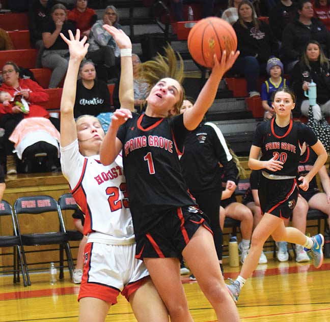 The Spring Grove girls are alone atop the SEC after three home wins within four days. The first showdown featured the only teams still undefeated in SEC play. Spring Grove defeated Houston 65-44. It was close – until it was not. The Hurricanes (5-1, 8-6) led 25-20 at halftime and trailed by only three about halfway through the second half. Then Houston added only one basket and a pair of free throws the final 8:30. Taylor Elton’s Lions scored 22 of the game’s final 26 points. Kinley Soiney hit four 3-pointers and led Grove (21 pts, 10 rebs). Avery Kingsley put in 21 points (4-9 threes, 5-6 FTs) for Houston. But three Lions scored in double figures. Emerson Ingvalson (14 pts, 6 asts, 5 stls) and Siri Konkel (12 pts, 5 asts, no turnovers) joined Soiney. Emily Botcher (9 pts) and Ainsley Rice (8 pts, 5 rebs) helped for the ‘Canes. SG outshot the ‘Canes 40% to 32% and shot more often with only eight turnovers to Houston’s 19. The Lions then turned away defending West champ Grand Meadow, 51-47. Konkel scored two late baskets then assisted on a game-clinching 3-pointer by Brinley Middendorf. The Superlarks trailed by 14 points before rallying back within one with Lexy Foster’s fourth 3-ball with 75 seconds remaining. It was a critical SEC contest as the Superlarks (8-6, 4-3 SEC) fell three games behind SG in the loss column. Konkel finished with a game-high 19 points (9-14 FGs, 4 asts, one turnover). Ingvalson had nine points and Carlie Halverson eight. GM’s Foster achieved a double-double (14 pts, 12 rebs). Lauren Queensland posted 13 (pts) and 5 (asts). Rylee Schaufler chipped in eight points. The Lions were outrebounded, 31-25, and were outscored from 3-point range, 21 to 12, but had only 10 turnovers and out-shot the visitors overall, 42% to 34%. In a 62-46 win over Lanesboro, the Lions led only 44-42 in the second half until LHS turnovers helped the Lions roar away with an 18 to 2 run. Soiney led SG (16 pts, 8 rebs). Konkel netted 12 points (6-10 FGs). Izabel Kaufmann and Halverson each added eight. Both Middendorf and Kylie Hammel had career highs with 10 rebounds. Lanesboro’s Jensyn Storhoff had a game-high 17 points (7 rebs, 5 stls). Taylor Hanson added 12 points (6-8 FGs) and Ellie Howard 9 points (3-8 threes). Lanesboro had 32 turnovers, SG 15. The first place Grove girls improved to 9-0 SEC, 13-2 overall. They lead Houston (7-1, 10-7), Kingsland (5-2, 8-3), GM (6-3, 10-6), and Lanesboro (5-3, 8-9).