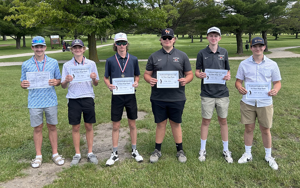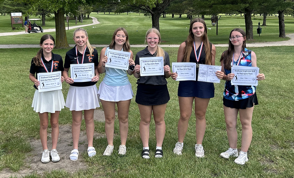 Lanesboro’s golf teams each won SEC Meet titles. The boys’ championship included a notable disqualification. Tim Opat’s group (341) topped Southland (347) with GMLO (372) taking third, Houston (403) fifth, and Kingsland (448) sixth of six complete teams. Burro frosh Jack Brogle (39/37) and Rebel senior Nick Edland (37/39), both individual state entrants last year, co-medaled with 76’s. Kaden Stettler (42/40 > 82) took third while Dayton Haugen (89, 7th-tie) and Grant Horihan (94, 12th-tie) rounded out the Burros scoring golfers. Southland’s other three team-scoring golfers were Braxten Wiste (43/42 > 85, 4th-tie), Kade Overocker (89, 7th-tie), and Derek Fredericksen (97, 17th-tie). Bradley Lagerstedt was disqualified, hampering Southland’s pursuit of both an SEC regular and post-season title. Houston was paced by Ethan Knutson (44/41 > 85), who tied for fourth. GMLO was led by Lincoln Lunning (43/44 > 87), who took sixth. Bulldog Graham Eastlee (92, 11th place), Hurricane Preston Peterson (94, 12th-tie), and Burro Holdyn Willford (95, 14th-tie) also made the top 15. Kingsland’s top golfer, Ethan Carr (96), took 16th place. Thirty-three golfers competed. On the girls’ side, the Burros easily (399) took first over Kingsland (483) with GMLO (515) and Houston (523) taking fourth and fifth (of five compete) teams. Burro junior Ellie McCabe (44/45 > 89) was meet medalist followed by seventh grade sister Addison McCabe (45/49 > 94). They were the only two to shoot sub-100. Teammates Grace Tufte (106 > 4th place) and Jentrey Schreiber (110 > 6th place) also finished top six. GMLO was led by Gabby Tangren (105), who took third. Kingsland’s Ryley Guy (111) and Emily Sargent (112) took seventh and eighth places. Houston’s Lexi Weichert (113) took ninth. Twenty-eight girls competed. Each 18-hole event was held at Adams’ par-72 Cedar River Golf Course.
