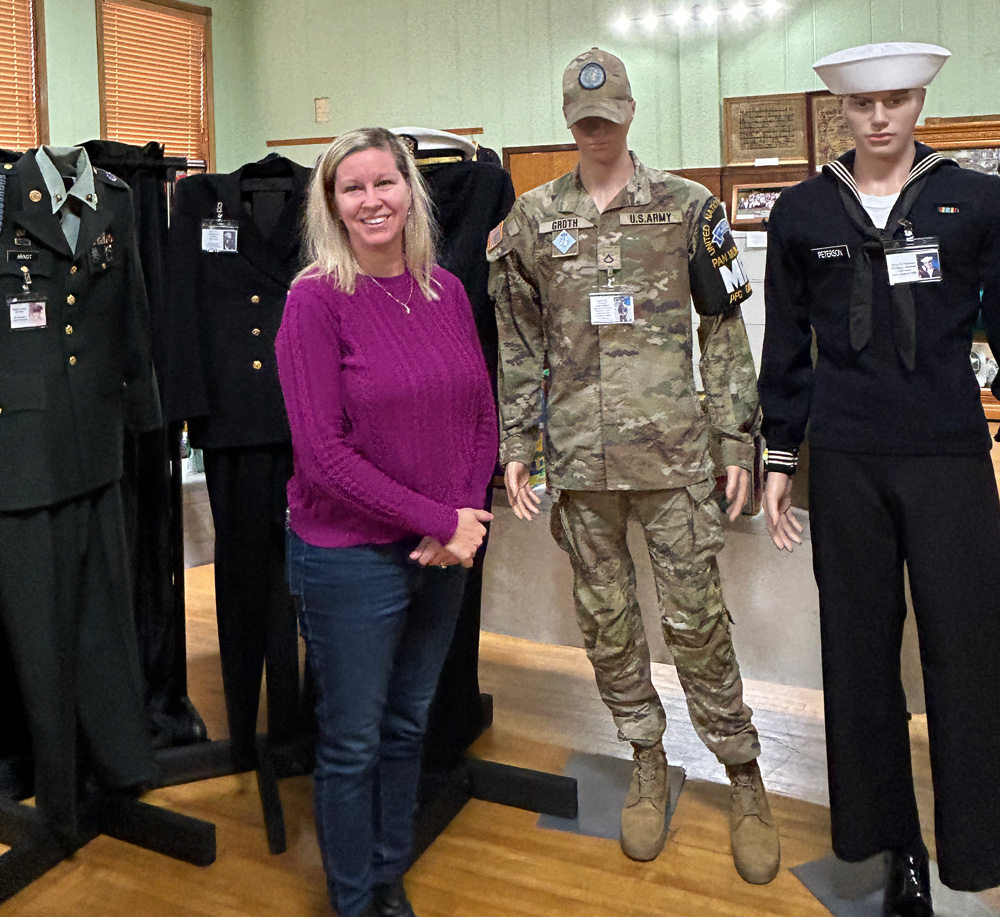Hoskins does a lot of the display creation in the museum including the armed forces area and the fire and ambulance area. One uniform in the armed forces display has a special significance to Michelle. It’s a uniform that her son, Tyler Groth, wore and donated to the museum. Michelle has creatively built many of the mannequins that display the service uniforms with two by fours to save money.