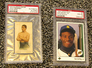 Professional Sports Authority (PSA), www.psacard.com, and Beckett Grading Service, www.beckett.com, are reputable companies that grade sports cards. You mail them in to get graded. The cost to grade cards starts at $15 can take 30 to 200 or 300 days to get graded. Then the cards are slabbed.