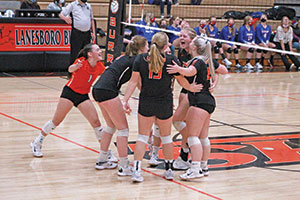 Lanesboro volleyball, prominently Malia Tessum (left facing) and Kaci Ruen (right facing) are pumped after taking the fourth set from Mabel-Canton, tying the match at 2-2. Ruen had a team-high 21 kills and Tessum a team-best 35 digs…