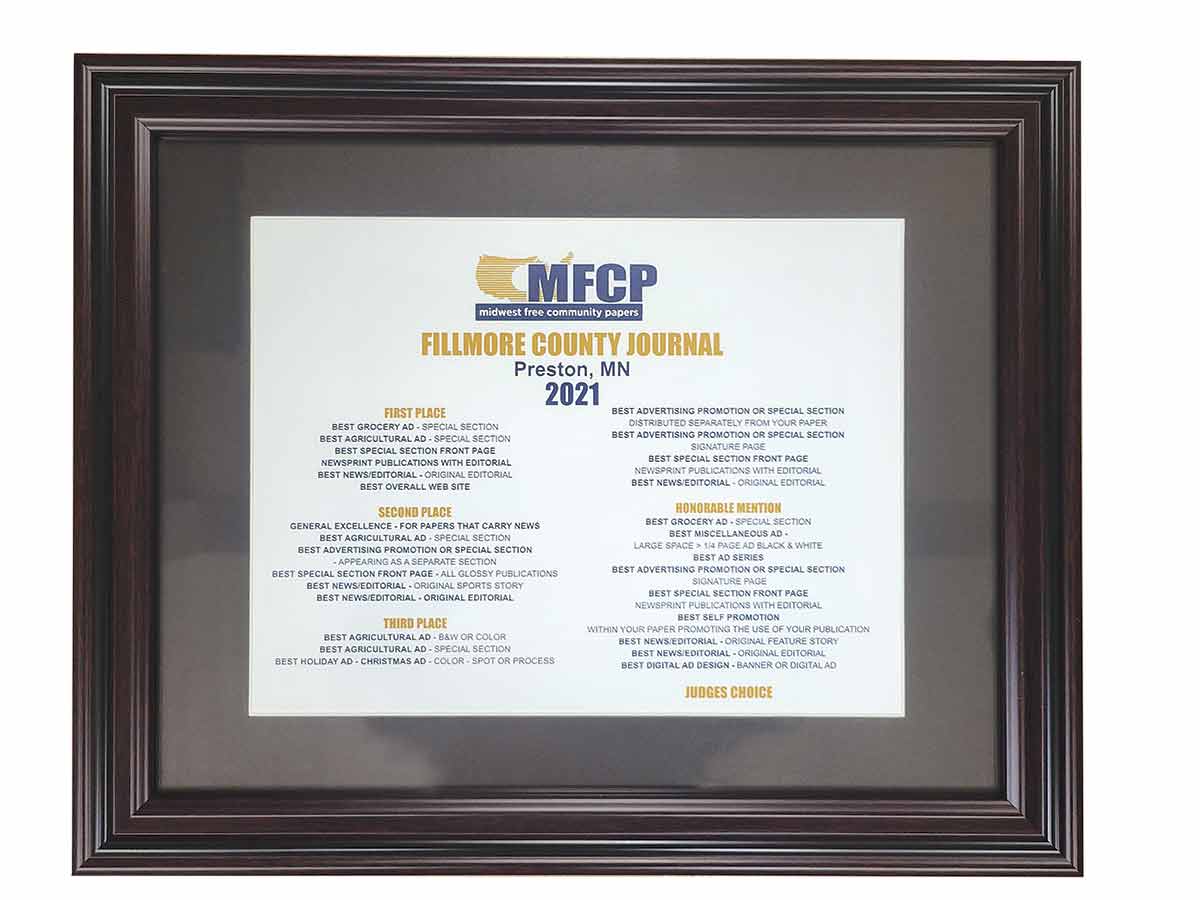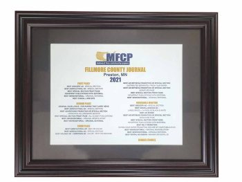 According to MFCP Executive Director Lee Borokowski, there were more entries in this year’s contest than ever before. Collectively, the Fillmore County Journal team has been recognized with 159 awards over the past five years from organizations such as Minnesota Newspaper Association, Midwest Free Community Papers, and Association of Community Publications.