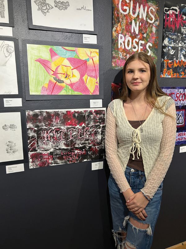 Katelyn Scheevel, a sophomore from Preston, has several pieces on display. She said her favorite piece is a charcoal of a lake her family had visited last summer. Katelyn used a color picture of the lake as a model as she did the subdued black and white art.