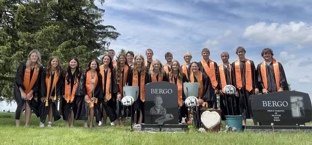 On graduation day, several of Hunter Bergo’s classmates visited his gravesite before going to the school for the graduation ceremony. Pictured are Makayla Ovelson, Elizabeth Hageman, Sophia Musselman, Cyan Ruen, Ellie Anderson, Lauren Brogle, Lelania Irish, Claire Keasling, Julia Keasling, Indy Qualy, Issac Snyder, Mason Howard, Michael Rein, Will Harvey, Luke Ruen, Caden Johnson, Ethan Soppa, Kaden Stettler and Boston Wright. Photo submitted