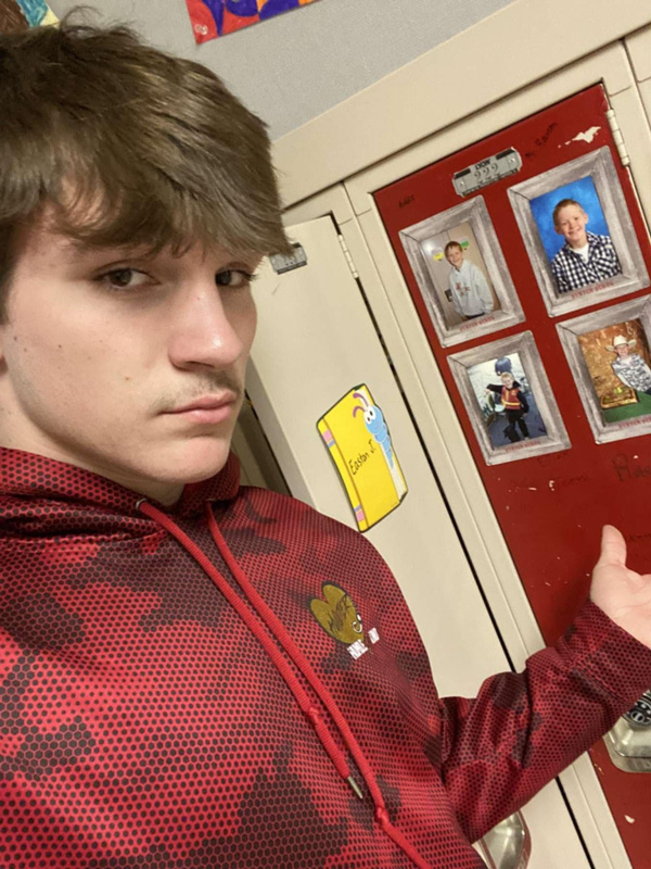 Boston Wright, classmate and close friend of Hunter Bergo, stands next to Hunter’s locker at LHS, which is still Hunter’s locker and is painted in his favorite color, red. Photo submitted