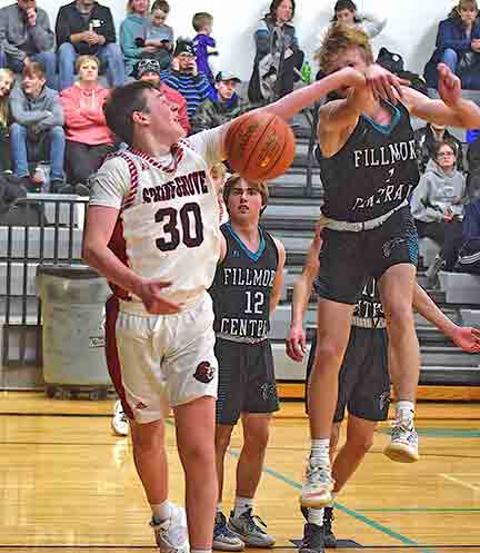 Back down by 10 points soon after the break, the Grove guys scored eight straight points to close within two. But a 9-to-2 Fillmore run made it a nine-point margin, 47-38. Then momentum swung again with 13 unanswered points for Spring Grove. A rebound basket from Hunter Holland finally put the Lions up, 48-47, with 5:11 remaining – their first lead since 24-22. A three-ball by Elijah Solum made it 51-47. It was 52-49 with 1:48 on the clock.