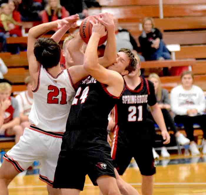 The Spring Grove boys opened the basketball season with a 45-51 win against New Hampton (Iowa Class 2A out of four classes). With a Dec. 4, Saturday morning tip-off, it was the first game at the annual Iowa-Minnesota Border Battle at Luther College in Decorah, Iowa.