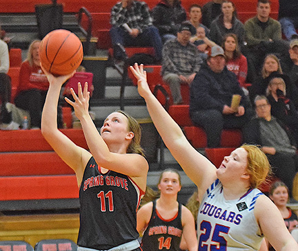 The Spring Grove girls won by 12 points after trailing by 11 points in the second half in the 57-45 home decision against Mabel-Canton on Jan. 12. Lion sophomore Kendal VanMinsel had an 11-point, 13-rebound double-double while Addyson McHugh scored a season-high 18 points. Emerson Ingvalson and Kylie Hammel were close to double digits with 9 and 8 points, respectively. Freshman Kinley Soiney led the Cougars with a game-high 22 points and completed the double-double with 11 rebounds.