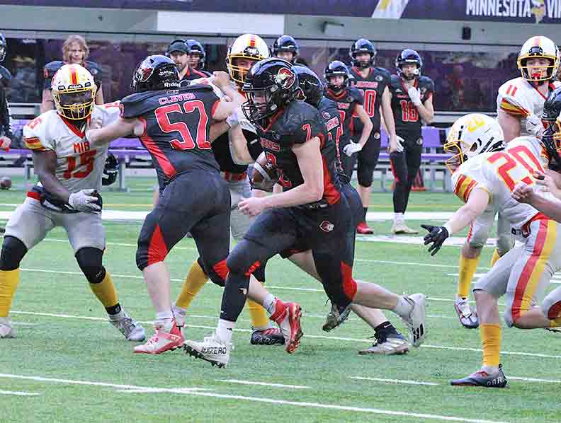 Spring Grove scored early and often and never trailed Mountain Iron-Buhl until the final 25 seconds of the 9-man state championship football game on Dec. 3 at U. S. Bank Stadium in Minneapolis. Ultimately, the 28-25 Ranger win, was decided by extra points with the Lions going 1 for 4 and MIB 2 for 4. When state-ranked No. 3 Spring Grove soared out to a 19-0 first quarter lead, it did not appear extra points would be a factor. No. 4 MIB overcame five turnovers but rallied by scoring in the fading seconds of each half.