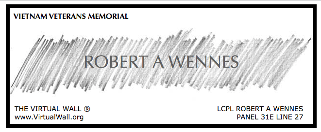If you visit the Vietnam Memorial Wall in Washington, D.C. or see the traveling wall when it is in the area, take a moment to find Robert A. Wennes’ name on Panel 31E, Line 27. Pause, take a photo, or leave a token of remembrance.