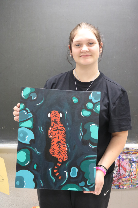 Wangen’s piece is an acrylic painting that took her approximately a month to complete. Wangen describes the painting as “a tiger in a swampy, lagoon-looking place with lily pads around it.” She chose very impactful colors for the painting.