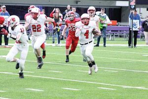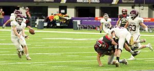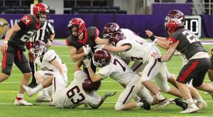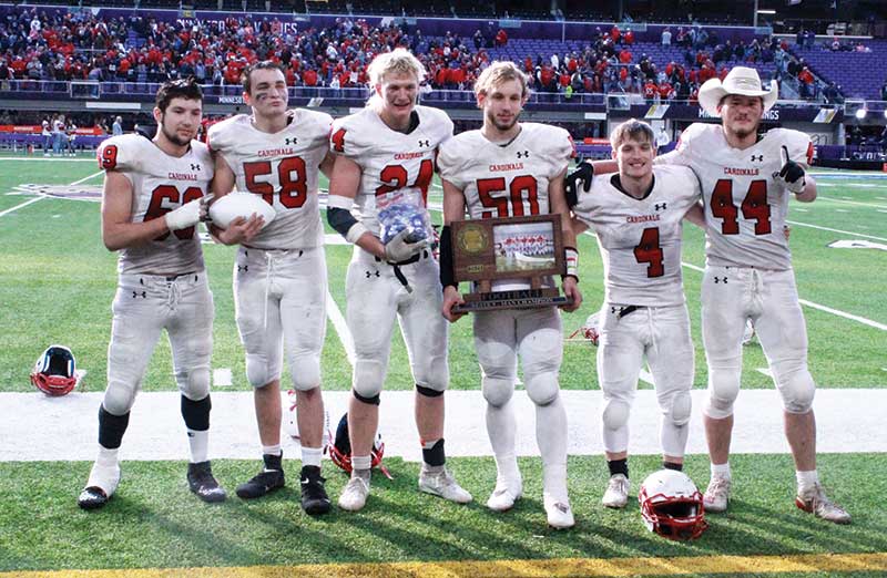 The towns of LeRoy and Ostrander are both small communities. LeRoy is known for its scrap metal processing plant and denoted by the number of semis that drive through heading to and from Hormel in Austin. Enrollment at the school isn’t high. Strong sports teams aren’t the norm. So, the 2021 football season won’t soon be forgotten. The Cardinals caught lightening in a bottle, interestingly enough led by a kid named Chase. Trevor Carrier’s crew didn’t just win the 9-Man State title. They out-scored three state level opponents 164-34! Versus unbeaten Fertile-Beltrami (Section 6 champion, 13-0) in the title game, the Cardinals (Section 1 champion, 11-2) dominated. How bad did it get? L-O senior Gavin Sweeney out-scored the Falcons by himself in the kicking game! The Falcons’ first two offensive plays each went backwards. They missed an open receiver on 3rd down. F-B punted. The L-O offense then began its onslaught. Three plays into their first series, Chase Johnson dropped a dime to junior wide receiver Tristan Lewison, who made a nice catch. The connection covered 29 yards and (with Sweeney PAT) made it 7-0. After forcing another three-and-out, Johnson authored the game’s most brilliant run. The 5’6” 170-pound senior weaved and cut every direction before diving into the end zone for a 54-yard TD run! Another Sweeney PAT made it 14-0. If Fertile-Beltrami was going to make it a game, the next series was their chance. The Falcons moved the ball (they ended up with 15 first downs). Late in the first quarter, they had 1st and 10 at the Cardinal 11. But on a 3rd down pass, Falcon QB Rylin Petry tried to throw a middle screen. L-O’s Tanner Olson is no regular d-tackle. The 6’3” basketball standout snared the pass, ending the drive. After a couple chunk plays, Lewison again caught a Johnson pass for a TD (38-yards). Sweeney’s PAT made it 21-0. Then a Lewison interception led to an Olson 1-yard TD run and a 28-0 lead. Then Johnson to Sweeney (10-yard TD pass) made it 34-0. F-B finally got on the board with just 41-seconds left in the half. But two plays later, Johnson threw his fourth TD, a perfect 55-yard pass to Layne Bird down the middle! It was over at halftime. L-O led 41-8. The Cards ultimately scored on nine of ten possessions. The final was 58-8! The chase to the title was led by the senior QB Johnson, who set a Prep Bowl record for most offensive yards in a game (412). Johnson completed five passes, four for TDs (5-7, 140 yards, 4 TDs). He nearly rushed for 300 yards (18-272, TD rushing). Eleven of his carries went for 10 or more (15.1 YPC). Lewison (2-67, 2 TD receiving), Bird (2-63, TD receiving), and Sweeney (10-yard TD reception) caught scores. Sweeney scored 10 points in the kicking game (7-7 PATs, 23-yard field goal), two more than the Falcons. He also had two sacks. Olson topped 100 yards and scored thrice (18-116 yards, 3 TDs rushing). Lewison and Olson had interceptions, the former a team-high 11 tackles. Hayden Sass recovered a fumble forced by Morgan Jasper. The Cardinals finished with 557 yards total offense, Fertile-Beltrami 214. The Falcons were led by RB Everett Balstad (14-70, TD rushing; 3-37 receiving), QB Petry (7-15, 103 yards, 2 INTs passing), and Ryan Van Den Eninde (3-59 receiving). L-O’s season finishes at 12-2. They won nine straight after starting 3-2. Their toughest games were the losses and wins over Lanesboro (27-38, 30-6) and GM (36-44, 39-34), as those squads were stronger than any the Cardinals faced at state. L-O has five seniors on their 19-man roster. The names Johnson, Olson, Sweeney, Jasper, Sass, and Memphiz Gomez won’t be soon forgotten.