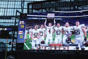 It is a very happy ending. All the drama that preceded it can just fade away amidst the ultimately successful season. Chatfield (Section 1AA champion, 12-1) took on West Central Area/Ashby (Section 6 AA champion, 11-1) for the Class AA state football title. And just like the drama that preceded – star running back Sam Backer’s ejection from the state semifinal and thus suspension from the title game (plus other proceedings) – the game itself was wild. It was decided on a conversion play in the 4th quarter. Jeff Johnson’s crew got off to a good start. The defense got a three-and-out. The Gopher offense went 60 yards in eight plays. Key runs were a drive-opening 18-yarder by sophomore QB Parker Delaney and 15 and 11-yard scampers by sophomore RB Kailan Schott. Delaney capped things by going right and reaching into the end zone for a 6-yard TD run, giving Chatfield an early 6-0 lead. But the Knights came right back. Quarterback Evan Paulson capped an 8-play, 68-yard series by hitting Cale Anderson for a 30-yard TD pass. With PAT, WCAA led 7-6. The score was aided by a Gopher encroachment penalty plays earlier, which turned a 4th and 6 into a (converted) 4th and 1. Turnovers were huge in the contest. Chatfield sniped five for the game. The second was massive. Midway through the second, Paulson was sacked by Campbell Berge on a scramble and the ball was dislodged. It popped right into the hands of Carter Daniels, who subsequently took it to the house for a 31-yard fumble recovery TD! A Drew O’Connor to Grady Schott two-point pass made it 14-7 Gophers. The second quarter featured five total turnovers, three by WCAA, two by Chatfield. The Gophers twice staved off Knight threats by recording turnovers in their end of the field. Daniels deflected a pass and Eli Hopp intercepted it at the Chatfield 29. After the Gophers subsequently threw an interception, Knight running back Anthony Sykora rumbled 17 yards to the Gopher 19, but he was stripped by Cole Johnson and Daniels recovered. The half ended with Chatfield leading 14-7. WCCA then opened the second half by on-side-kicking and recovering it. Paulson then hit Hunter Norby for a 37-yard reception to the Chatfield 10. But the stingy Gopher defense stopped the Knights on fourth and goal from the five. Chatfield’s “D” was again called to task in the 4th quarter. WCCA’s best series of the game went 76 yards and took 12 plays. It was almost ended via a game-changing turnover. WCCA back Mattson Hoff fumbled amidst a gang tackle. Gopher Eli Hopp picked up the ball and ran 70 yards for a touchdown. It would’ve given Chatfield a 20-7 lead midway through the fourth. But the review booth overturned the play. Later, on 3rd and goal from the one, Paulson found his way to paydirt pulling the Knights within one at 14-13 (3:51). WCAA then went for two. Officials initially granted the conversion. But a review ruled the ball-carrier down at the one. Chatfield Nation expired. The Gophers remained ahead 14-13. They got one first down on their next drive, but punted. Berge’s 46-yard boot had WCAA starting at their won 6, with 1:24 left, and one timeout. The Knights completed a few passes including a 27-yard hook-and-ladder. They got to the 49. But a desperation Paulson pass was intercepted by Gopher safety Isaac Erding. A thrilling game was over. By a final of 14-13, Chatfield won the 2021 Class AA state title! It was mostly a defensive effort. Erding had two interceptions. Berge had the forced fumble that led to Daniels’ return TD. Daniels also recovered a fumble forced by Johnson, and he deflected the pass Hopp intercepted. The Gophers held WCAA to 68 yards on 31 attempts rushing. They had five tackles for loss and stopped eight runs for zero yards. Luke Carrier and Kail Schott were each credited with four of those ‘no gain or less’ stops. Offensively, K-Schott (10-71 rushing), Delaney (13-35, TD rushing; 5-13, 67 yards, 2 INTs passing), Jackson Schild (8-32 rushing), and Grady Schott (5-17 rushing; 31-yard reception) did work. WCAA’s defense held the Gophers to 210 total yards. WCAA had 289 total yards with 221 coming through the air. Paulson (15-29, 203 yards, TD, 3 INTs) threw a lot, Anderson (4-67, TD receiving) and Norby (4-71) his top targets. Sykora (21-63 rushing, 3-33 receiving) led the Knight ground attack. Each team had 12 first downs. Ten of Chatfield’s came on the ground, eight of West Central’s through the air. Chatfield won the turnover battle five to two. The Gophers end the year at 13-1. The team to beat them, P-E-M, was Class AAA State Runner-Up. Like the 2013 state title team, this year’s group won 13 straight after an 0-1 start. Chatfield has just six seniors. G-Schott (ILB/RB/TE), Berge (NT), Mason Clemens (G/DL), Ethan Ruskell (DE/T), and Caden Nolte (C/DT) were big-time contributors. Nolte was given an award for team MVP after the game. Dylan Cocker (WR) rounds out the class. The Gophers proved that, even without all-everything Sam Backer, they are damn good. They did it without him. Backer, who couldn’t watch the game on the sideline, was back with his team for a post-game photo. It is Chatfield’s fifth state football title (1994, 1995, 1996, 2013). They’ve won a state title five of their last six appearances (1999 the exception); that’s a 15-1 record over 16 state games.