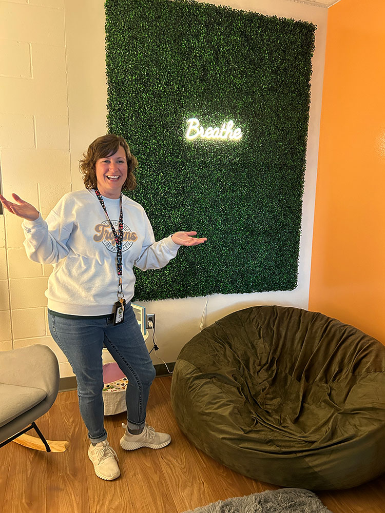 A year ago Kelly Smith, R-P’s school social worker, came up with the idea to create a student wellness room for high school students. She polled students, asking what they felt they needed. She also got input from Brenda Pohlman, Fillmore County Health Educator. Pohlman promoted the idea of including items to appeal to all senses in the room.