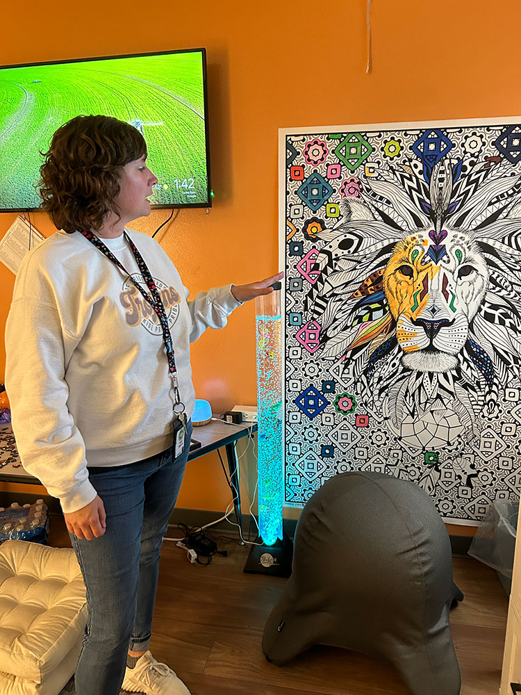 Over the summer, Smith, with the help of Jenny Helgemoe, the high school counselor, transformed a former conference room just off the media center. They equipped it with soft lighting, fidgets, puzzles, comfy seating, a soft rug, a step exerciser, a white board and a huge coloring poster.