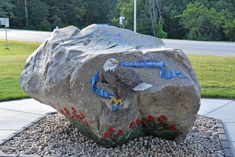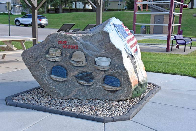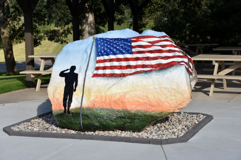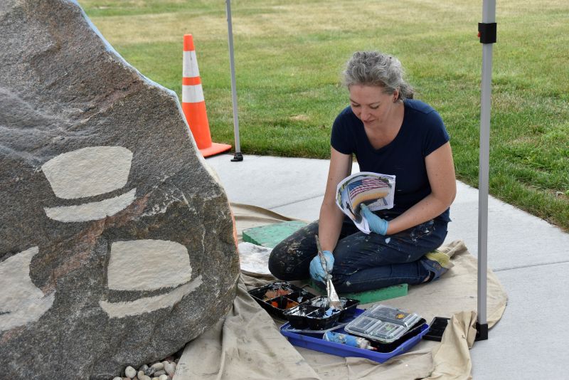 Top photos, Sarah Pederson of Lucid Painting, Coon Valley, Wis., was commissioned by the Caledonia Street Scapes committee to paint a boulder to recognize and honor all our veterans and active military members. The rock is located at North Park in Caledonia, Minn., visible to all who travel Highway 44. This mural is not officially connected to or endorsed by the U.S. Dept. of Defense or any of its branches.
