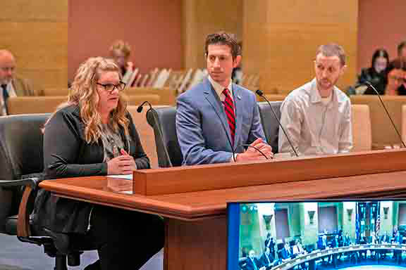 Senator Miller and Councilmember Rohland listen while City Administrator Elton testifies to the committee.