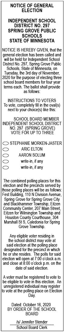 Notice of General Election Independent School District No. 297 October 26, 2020 by Fillmore County Journal