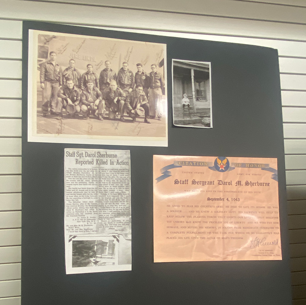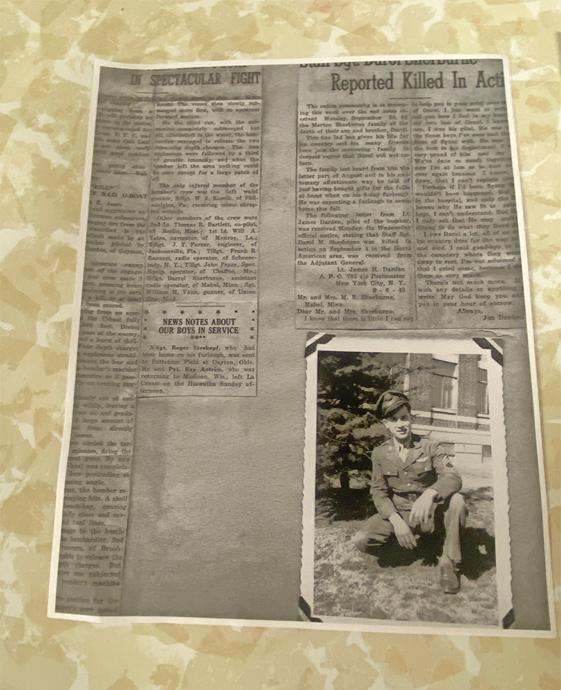 The usual pilot, 1st Lt. James H. Darden who was grounded on that day expressed his sympathy to Sherburne’s family, “He was one of the finest boys I’ve ever had the privilege of flying with. He was one of the best in his department. I was so very proud of him and my crew… I said goodbye to him at the cemetery where they were laid away to rest…(and) cried…”