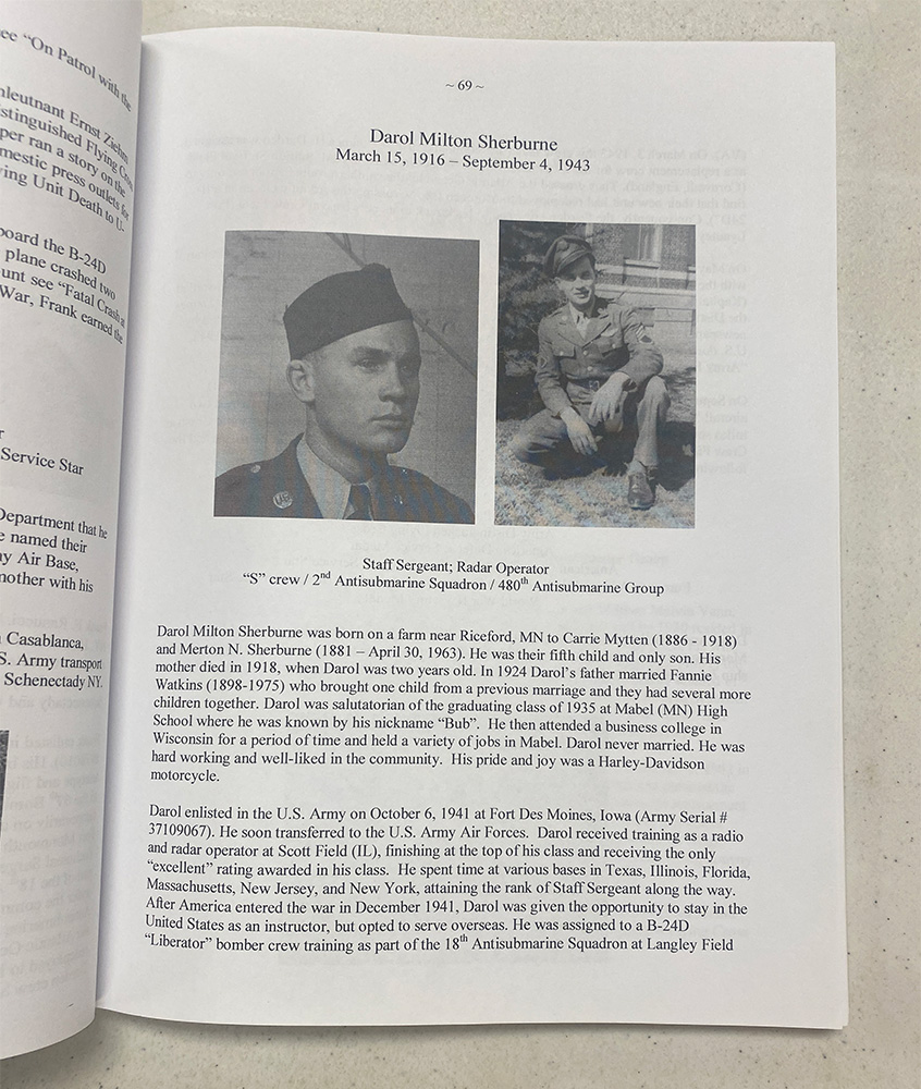 The section in the book “Across the Dark Waters: Life and Death in the U.S. Army Air Forces 2nd Antisubmarine Squadron” by James Pontolillo, about Staff Sergeant Darol Sherburne. Photo by Charlene Corson Selbee