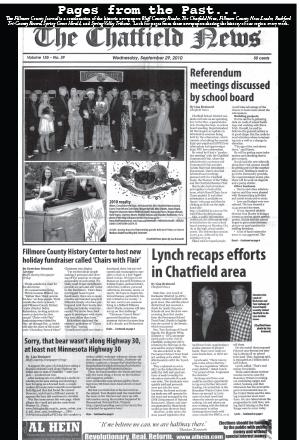 These archives are so important because they contain history from our area that is pre-Internet. And, we feel it is important enough to share that history from all of these newspapers that we have dedicated space for a weekly feature titled “Pages from the Past…” Look for the debut in today’s newspaper. Our first spotlight is on the front page of the Chatfield News from 2010 – exactly 10 years ago.