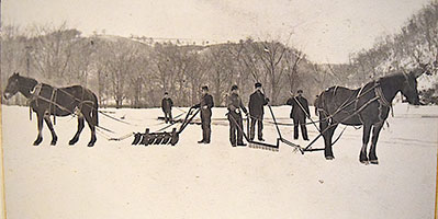 During the Great Depression of the 1930s, the lack of jobs made it easy to hire ice-cutters, who worked hard for $2.50 a day. However, Sweet pointed out the danger of a man falling into the water. “Once when one man fell in, we rushed him home. After he changed into dry clothes, he warmed up with a couple of swigs of his moonshine and went right back to work.”