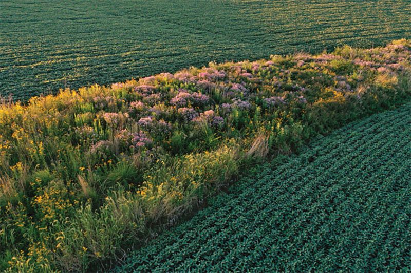 An exciting opportunity for prairie strips is now available for area farmers. Prairie strips are a fairly new CRP practice. They reduce erosion, improve water quality, and create insect and bird habitat by establishing strips of native prairie vegetation on a field. They can be placed across a field in one or more contour strips, along grassed waterways or terraces, or on field perimeters or headlands. Planted as contour strips, they can give you the erosion-saving benefits of hay strips without the extra time and labor that comes with managing a hay crop. On field perimeters they can act as a nice buffer between your crops and adjacent woodland. On field headlands they can replace the end rows that are running straight up and down the hill, covering this area in sod and eliminating the severe erosion that often occurs there. They can also be used to “square-up” the ends of oddly shaped fields, making them easier to farm.