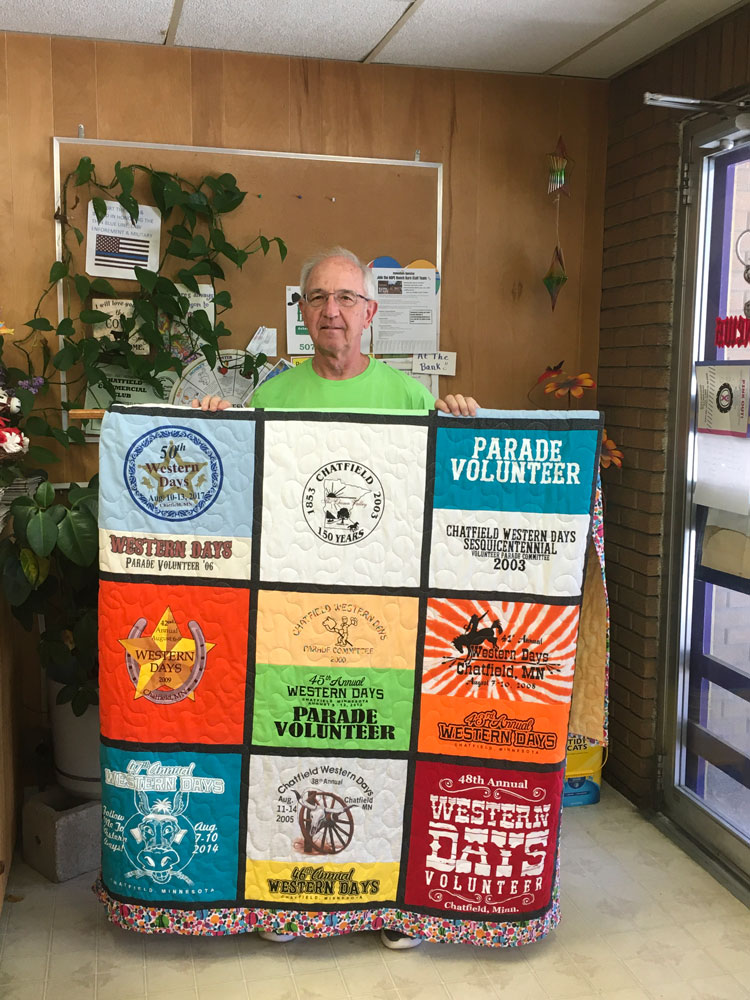 Matt Opat, the 2024 Chatfield Western Days Honorary Grand Marshal, holds a quilt made by his wife Therese. The quilt is made of a collection of Western Days t-shirts the couple accumulated over the years. Photo courtesy of Western Days