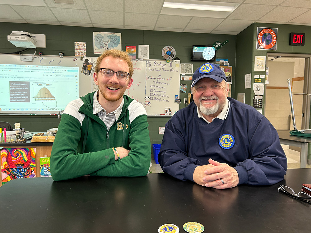 Left to right: R-P teacher Jacob Kramer and Lion Larry Bartelson are successfully collaborating on the plastic bag recycling program. Photo by Wanda Hanson