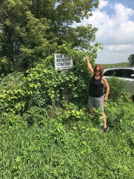 We crept along a desolate gravel road and saw a glint of white buried in the bushes. We pulled back the foliage and found a sign, “Oak Hill Methodist Cemetery.” A narrow grass road between two corn fields brought us to a clearing and the cemetery. A large headstone with SIMS in bold letters welcomed us and almost looked to be saying, “What took you so long?”