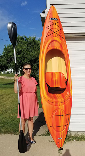 Beckie Kronebusch of Plainview, Minn., stands next to the brand new kayak that she won in a recent contest.