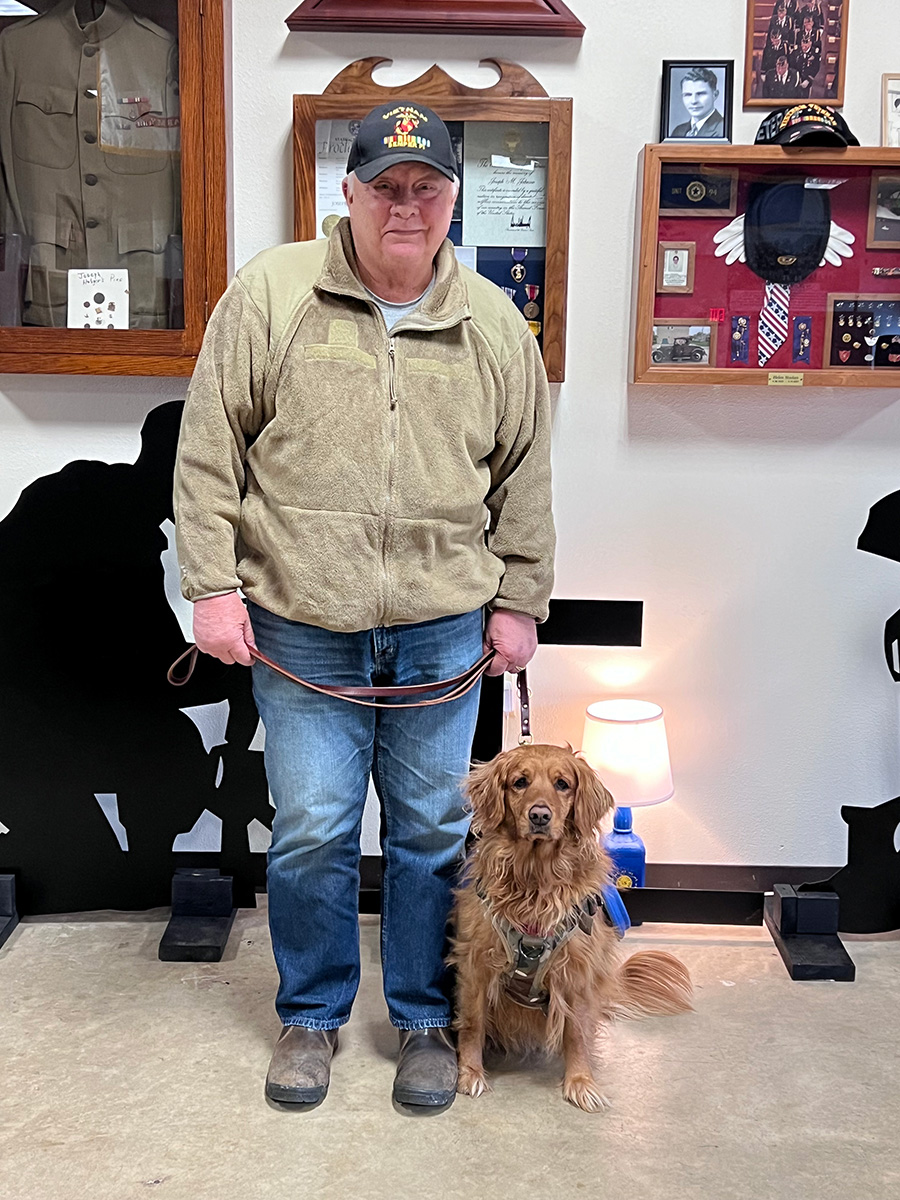 As of June 26, 2023, the American Legion Post 94 in Rushford, Minn., has its first ever mascot – a dog named Bella. But this four-year-old Golden Retriever is much more than just a pretty face. She is veteran Ron Petersen’s service dog. Petersen served in Vietnam with the Marine Corp and has been dealing with the aftereffects for many years. To help with this, one of his VA medical providers suggested he try a service dog. After receiving approval from his doctor he looked for a place that trained service dogs and decided to go with PAD (Patriot Assistance Dogs).