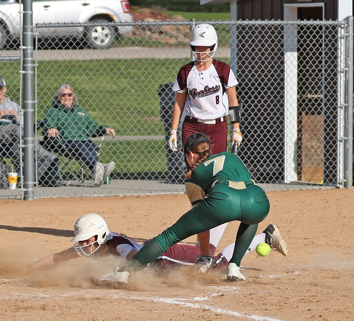 Fillmore Central/Lanesboro 4, GMLOK 3 (FCL: J. Storhoff 6 IP, 5 H, 3 R, 1 ER, 0 BB, 6 K, Win; J. Ristau 2-4, RBI, R; E. Anderson 1-4, RBI, R; H. O’Connor 1-3, RBI; K. Biel 1 IP, 1 H, 0 R, 0 BB, 1 K, Save. GMLOK: A. Kolling 1-3, 2 RBI, 7 IP, 8 H, 4 R, 2 ER, 4 BB, 4 K, Loss; M. Voigt 2-4, 2B, R. Down 2-0, GMLOK scored three in their sixth, two on a Kolling single, to make it 3-2. FCL then got RBI hits from Anderson and Ristau (the game-winner) in the top of the inning. GMLOK left the tying run on second in the final inning. FCL won its second, eclipsing last year’s win total. GMLOK > 3-2, 4-7)