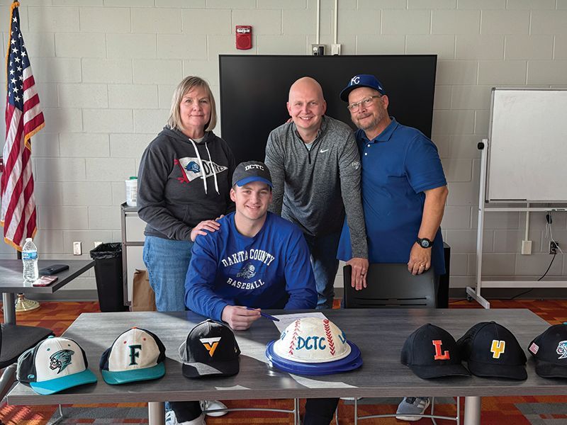 Lanesboro’s Levi Rogers recently signed a letter of intent to play baseball at Dakota County Technical College. Rogers is pictured with mom Jennifer, brother Jake, and dad Dave. Photo by Kristi Ruen