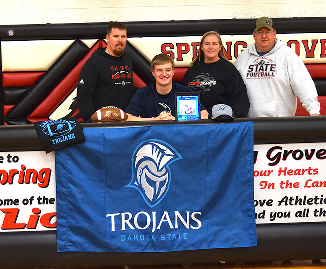 Spring Grove senior Ethan Crouch has signed to play college football at Dakota State in South Dakota. Observing from left is Spring Grove head coach Kody Moore and parents Sue and Jason Crouch.