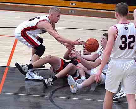 SG INDIVIDUALS: P-points, R rebounds, A-assists, S-steals, B-blocked shots. Listed in order of jersey number. *starter. Caleb Griffin 1P, 1A; *Tysen Grinde 25P, 6R, 4S, 1B; *Hunter Holland 2R, 1A; Logan Brumm 1R; Jacob Olerud 1R, 1A, 2S; *Carson Gerard 12P, 4R 4S, 1B; *Jaxon Strinmoen 2P, 6R, 2A, 2S; *Elijah Solum 14P, 2R, 5A, 4S