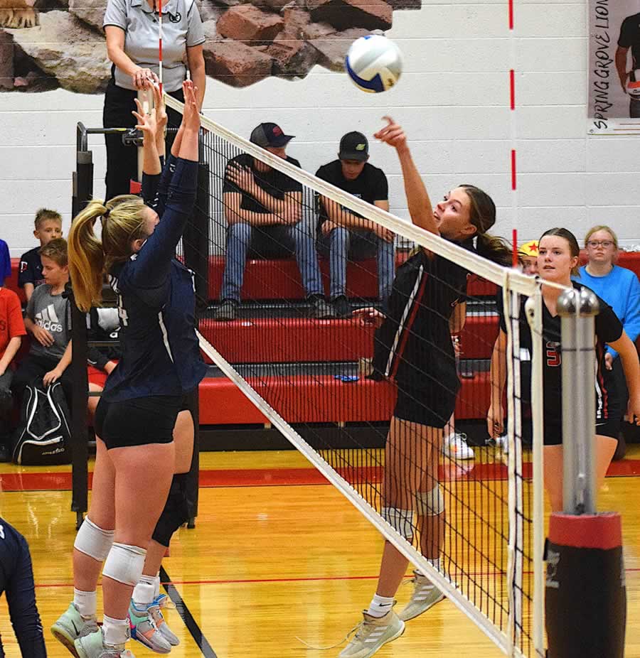 The Lions served 19 aces with only four errors, including a half-dozen aces from Emerson Ingvalson and four from Izabel Kaufmann (13 for 13 serving). Jordis Neeley led scoring with 12 kills (on only 21 attacks, 48% efficiency), a block and 3 aces. The match began with three Spring Grove hitting errors, but the Lions took 12 of the next 13 points and never trailed again. Grove led only 5-4 in the second set before an 11-to-2 scoring run. The Lions scored the first seven points in the final set.