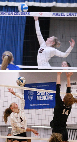 In set one, Mabel-Canton took an early eight-point lead, 9-1, which the) home team sustained during a 10-point win (25-15). The Lions got off to a better start in set two, leading 6-5 before the Cougars took seven of the next nine points and went on to win by six (25-19). It was another six-point decision in set three after the Lions had trailed by as many as 11 points.