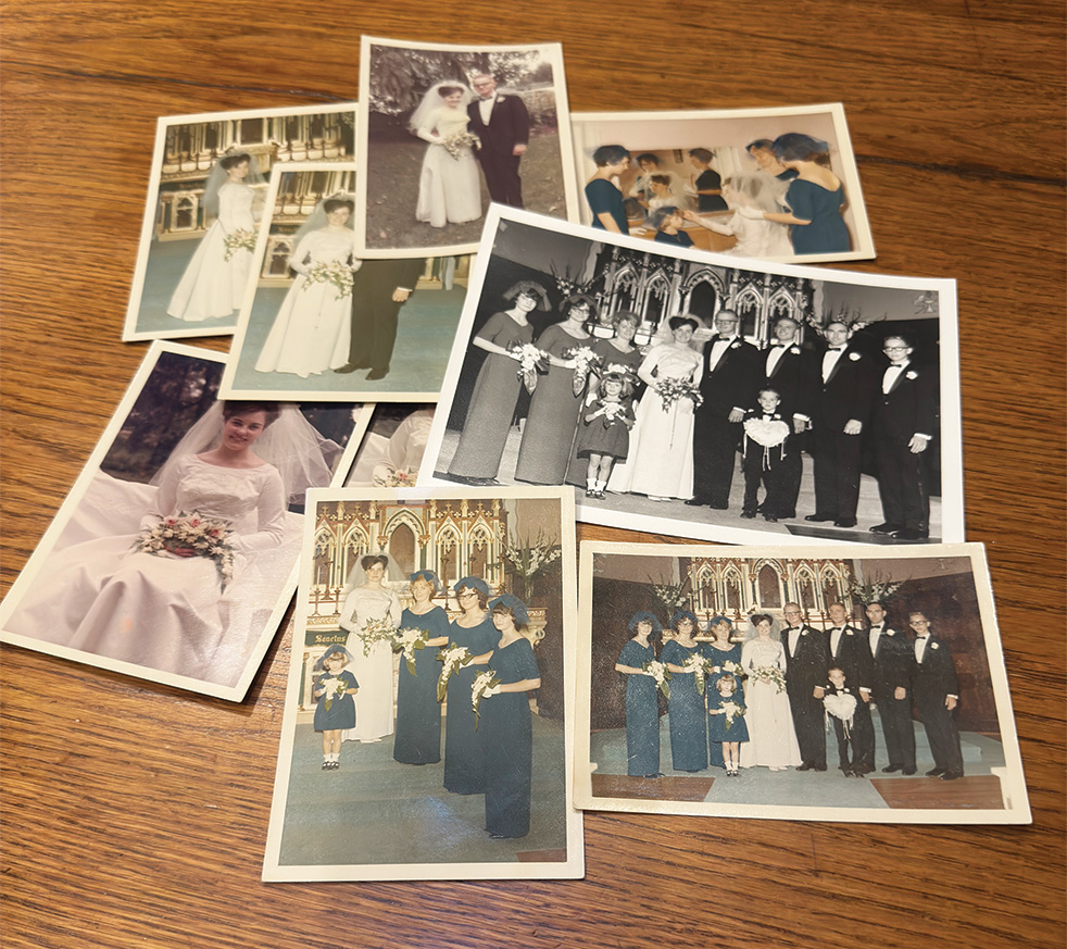 Mary Helen chose royal blue for her bridesmaids’ dresses, a color she loved, as evidenced by the blue accents in their home today. After the ceremony, the guests headed down to the church basement for dinner, followed by a reception at her parents’ home. It started to rain after the bride and groom left for their honeymoon. Mary Helen said she felt so sorry for her mom because the ends on the carpet curled up because it was so wet.
