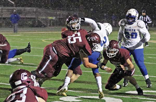 LeRoy-Ostrander made the most of its first state football tournament appearance in 17 years with a 57-26 quarterfinal flogging of Wheaton/Herman-Norcross amid snow flurries at Macalester College in St. Paul. In the state’s highest-scoring quarterfinal, the Cardinals finished with 57 points for the fourth time this season. L-O (9-man Section 1 champ, 9-2) and the Warriors (Section 4 champ, 9-2) equally divided the first four touchdowns and much later equally shared the final four scores, but the middle four TDs were all Cardinals as L-O left the Warriors behind before halftime. Senior signal-caller Chase Johnson had 429 yards of total offense, rushing for 319 yards and two touchdowns (6 and 51 yards) plus two extra-point runs while also passing for 110 yards, two TDs, and an extra-points completion. It was nothing new as Johnson had led the sub-district in both rushing yards and passing yards as well as rushing touchdowns and passing touchdowns. Senior running back Tanner Olson (6’2”, 200) rampaged for 152 yards, including four TD runs of 33, 1, 6 and 19 yards plus a two-point conversion. It was back-and-forth early with both defenses prevailing as only six of the eventual 83 points were scored during the first quarter. After the first L-O possession ended with its only turnover of the night and the first Warrior drive ended on their only red-zone denial at the L-O 8 yard-line, the teams traded scores twice. The Cardinals trailed 6-0, led 7-6 and then trailed again 12-7 before scoring 36 unanswered points. L-O erupted with 29 points in the second period to take a commanding 29-12 lead into halftime. Any hopes for a W/H-N second-half resurgence were quickly quelled when Johnson intercepted a Warrior pass just two plays after intermission. Spanning halftime, the Cardinals scored on their final six possessions before taking a knee at the end. L-O could both run and pass, but W/HN gained only 72 yards on the ground. However, Zachary Braaten completed 22 of 34 passes (65%) for 265 yards and all four Warrior touchdowns (44, 15, 21, 16 yards). But the 6’3” senior was also intercepted twice. For the Cards, Johnson completed 7 of 11 passes (64%). After his first attempt had been intercepted, Johnson’s second aerial found Tristan Lewison behind the secondary for a 40-yard TD. The two-point conversion toss to Layne Bird put L-O ahead for a second time, 15-12, this time a lead the Cards would not relinquish. An 18-yard pass to Lewison came one play before Olson bolted 33 yards to make it 23-12. Then a 36-yard pass to Lewison set up a 4-yard TD toss to Bird just four seconds before halftime (29-12). Lewison, the sub-district’s leading receiver, finished with four receptions for 100 yards and also intercepted one enemy aerial. Gavin Sweeney had one reception on offense and kicked an extra point. Defensively, he had two sacks, a fourth-down tackle for no gain, and blocked an extra point kick. After the opening turnover, the Cardinals scored on 8 of 10 possessions. They faced fourth down only three times; they never punted but twice lost the ball on downs. The O-line, Sweeney, Hayden Sass, Morgan Jasper and Malyk Schaefer, cleared paths for 467 yards rushing as L-O outgained the Warriors overall, 577 yards to 337. Both teams came in with 9-2 records. It was the Warriors’ first trip to state since 2012. L-O (10-2) advances to a state semi-final versus Kittson County Central (Section 8), which qualified with a 27-20 win over Ogilvie. The Bearcats (10-2) are averaging twice as many points, 32, as they give up, 16. KCC returns to state for the first time since falling in the 2013 semi-finals to state champion Grand Meadow.