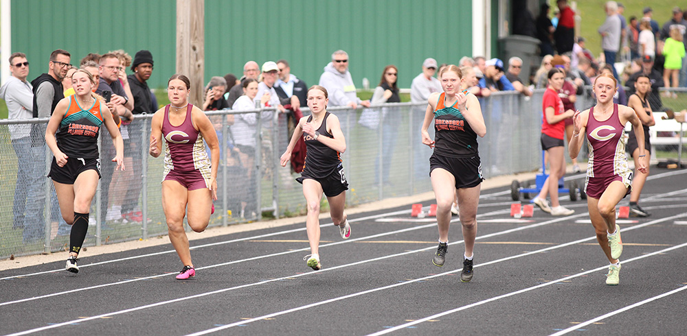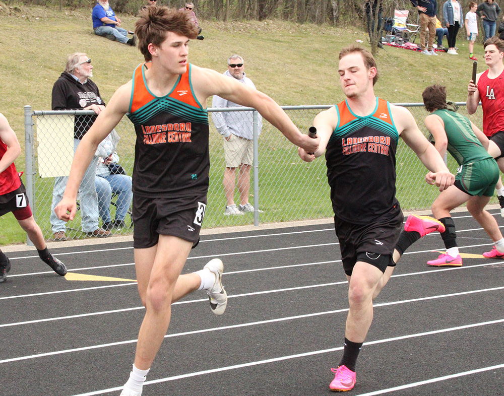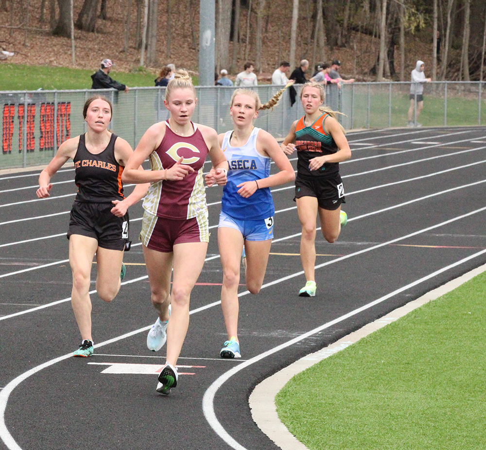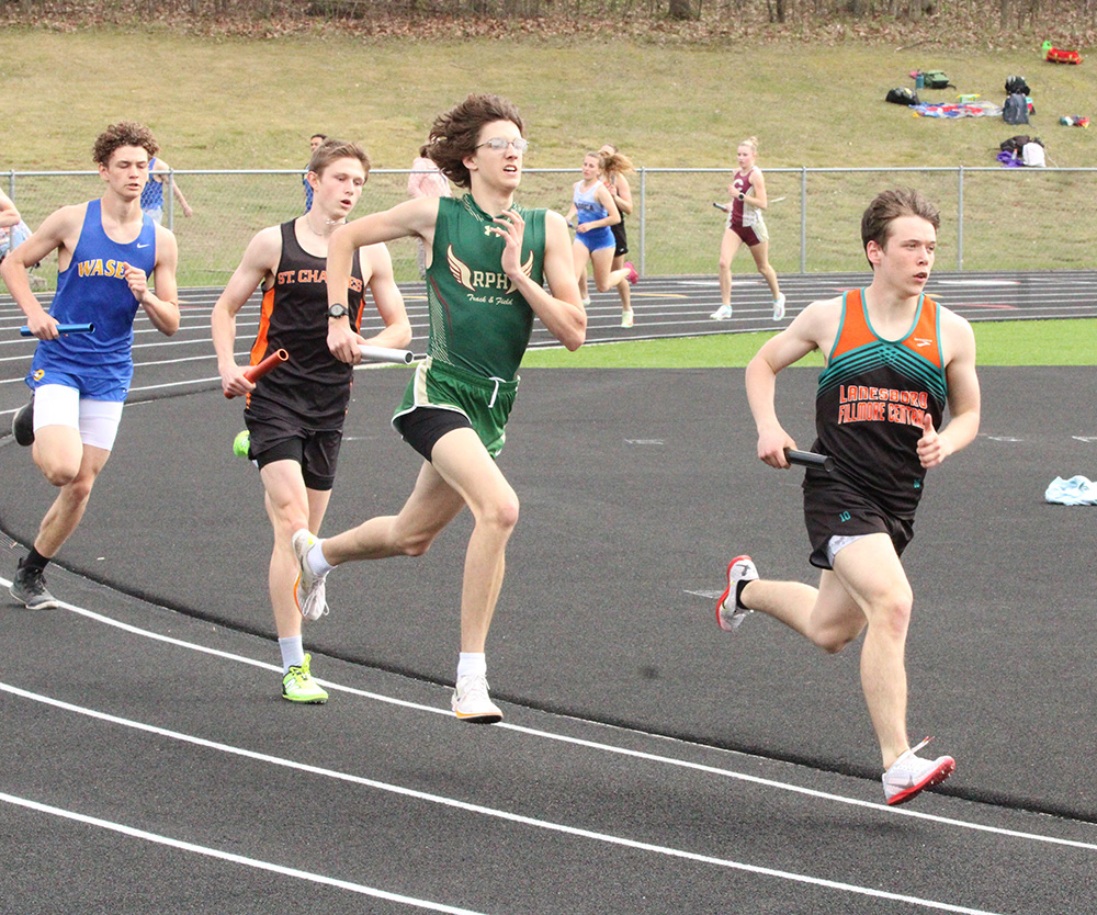 St. Charles Meet (RPH’s guys (116) took second to St. Charles (187) with LFCMC (101) taking third. The Saint girls (120.5) topped Waseca (104) with Chatfield taking third (99), LFCMC fourth (80), and RPH fifth (68). L-A and Hayfield’s girls also competed. Chatfield girls’ firsts: Jaelyn LaPlante (100 > 13.38; High Jump > 5’0”), the 4×100 (51.80 > Lauryn Daniels, Savannah Peterson, Evy Goldsmith, LaPlante), and 4×200 (1:49.65 > same). Peterson added a second (200) and a fourth (Long Jump). Adia Evans (400) and Lexi Kivimagi (1,600) took second. Rebecca Copeman took third (Triple Jump), fourth (300-hurdles), and fifth (100-hurdles). Jake Stevens (Shot Put > 45’7”) had Chatfield’s only guys’ first. LFCMC girls’ firsts: Kammry Broadwater (800 > 2:33.49; T-Jump > 33’0”) and the 4×800 (10:29:53 > Kyla Hellickson, Sahara Morken, Brooklyn Simon, Autumn Rakosnik). The 4×400 (Simon, Morken, Olivia Rindels, Lillyan Kiehne) took second. Kiehne (1,600) added a third. LFCMC boys’ firsts: Jayce Kiehne (400 > 49.99), Luke Ruen (800 > 2:04.84), Lucas Nikoloski (Discus > 142’8”), and the 4×200 (1:35.88 > Mason Howard, Henry Liew, Michael Rein, Greg Kennedy). Boston Wright (Pole Vault) and Brody Niemeyer (Shot) took second. Liew added two thirds (Long Jump, T-Jump). Howard added a third (200). RPH girls’ only first (tie) was Lauren Honken (P-Vault > 8’6”). Aubry Boldt took second (100-H) and third (L-Jump). Ava Helgemoe took second (T-Jump) and third (800). Jorja Meyer took second (Discus) and fourth (Shot). RPH’s boys’ firsts: Quintin Betthauser (110-hurdles > 15.93; 300-H > 43.13) and the 4×400 (3:37.97 > Q-Betthauser, Tyler Betthauser, Hunter Rislov, Ryan Prinsen). Prinsen added a second (800) and a third (P-Vault). Gregg Gile had two seconds (200, T-Jump) and a fourth (L-Jump). The 4×800 (Aaron Ploetz, Matthew Sprague, T-Betthauser, Prinsen) took second. Casey Herek (110-H) took third and fifth (300-H). T-Betthauser (1,600) and Ploetz (3,200) added thirds.)