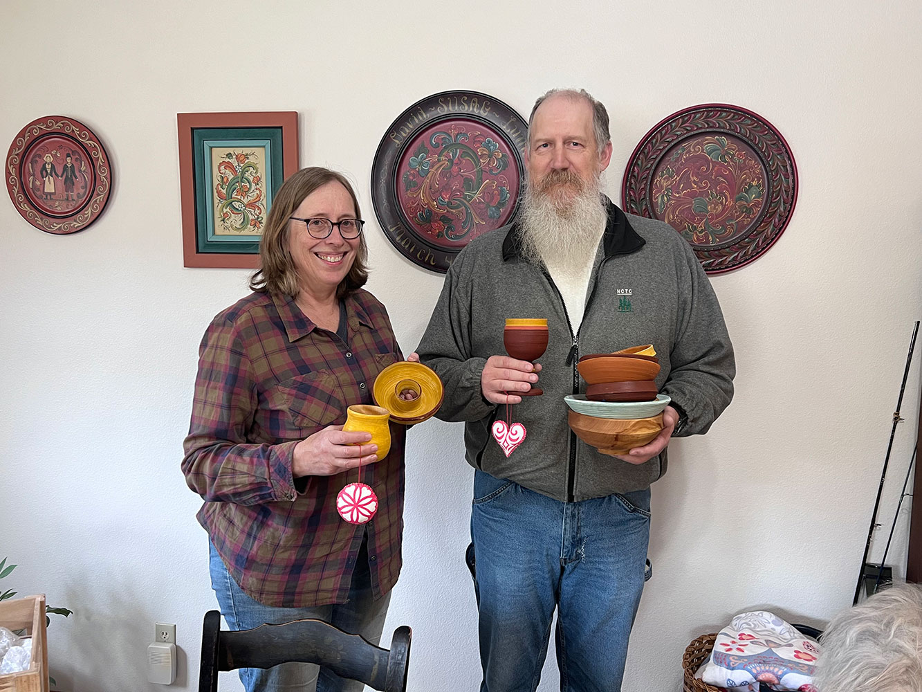 They decided to go for it and took early retirement when they were able so that they could focus on learning, practicing and perfecting their trades. It was important to them to be able to take classes and learn while they were still young. After David retired in 2021 they started traveling more throughout the upper Midwest for demonstrations and to sell their own items. Up until that point their items were only being sold at gift shops, and mainly through the Vesterheim. They started selling at their demonstration booths a few years ago at Gammel Dag Festival in Peterson, Minn.