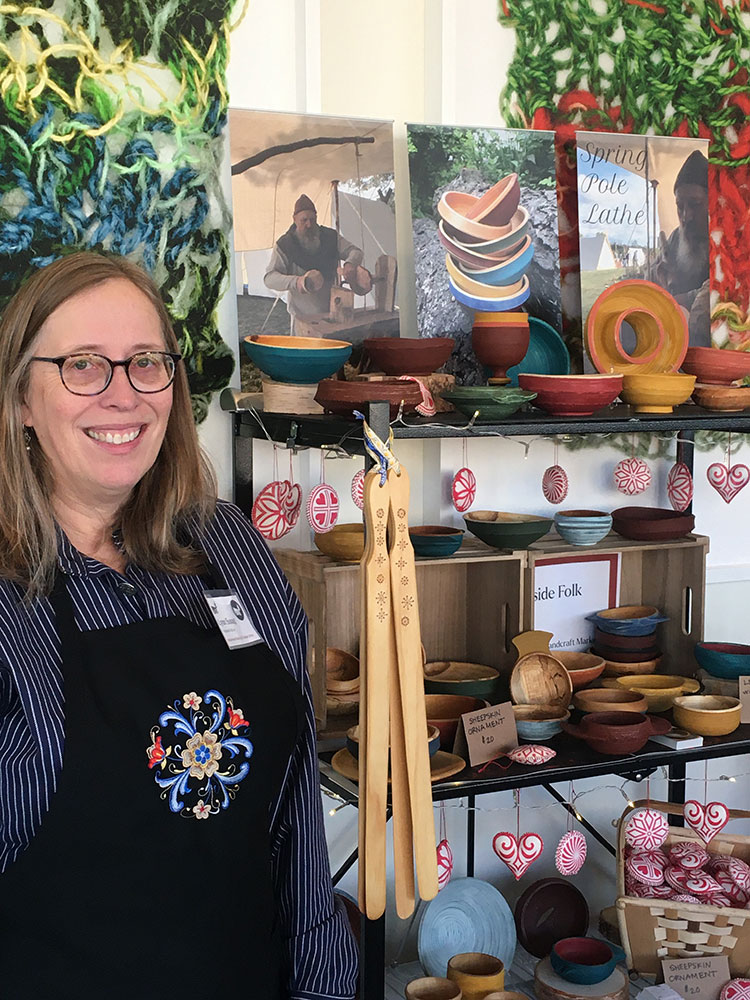 David and Lynn Susag of Lanesboro, Minn., share their love of Nordic handcrafts with the local community and upper midwest through Trailside Folk Art, where they specialize in Nordic handicrafts and ancient techniques. Over the years they have demonstrated paper cutting and hand sewing as well as knife making, but their main focus is demonstrating and selling wooden dishes turned on a spring pole lathe and skinnfell items.