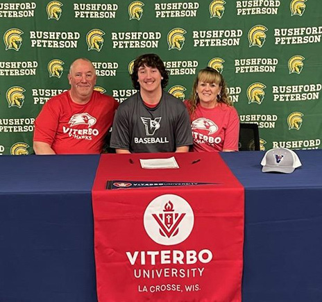Rushford-Peterson’s Rylan Schneider signed a letter of intent to play college baseball and bowling at Viterbo University in La Crosse. He is pictured with his parents Todd and Missy.