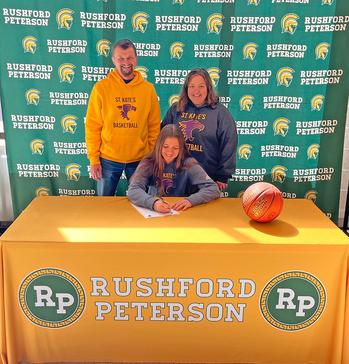 Rushford-Peterson’s Ellie Ekern recently signed a letter of intent to play college basketball at St. Catherine University in St. Paul. She is pictured with her parents Ben and Holly Ekern. Photo by Jake Timm