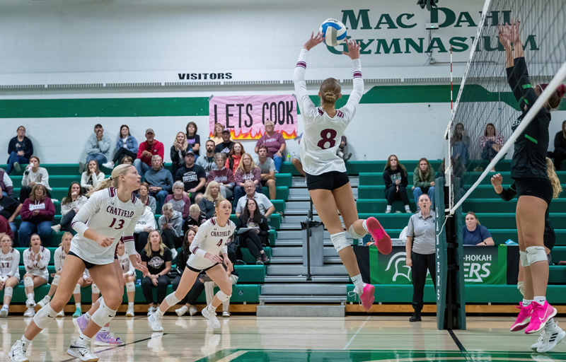 There is not much doubt. Chatfield volleyball is the best team in the Three Rivers Conference this year. Kristi Rindels’ Gophers won their final two league matches to go unblemished through the schedule. At home, they beat St. Charles 3-0 (25-9, 25-7, 25-21). Jaelyn LaPlante (10 kills, 5 digs, 16-16 serving, 5 aces) and Trindy Barkeim (10 kills) each got to double-digit kills. Harper Goldsmith had 7 (kills) and 12 (assists). Hannah Tweten (13 assists), Mya Henry (8 digs, 3 aces), and Kylin Schroeder (2 kills, 4 digs, 17-17 serving, 3 aces, 2 blocks) helped. With the win, Chatfield (9-0, 23-4) clinched the TRC title. The Gophers then shored up a perfect league season by sweeping La Crescent/Hokah 3-0 (25-15, 25-17, 25-17). LaPlante led the team offensively (17 kills, 8 digs). Goldsmith (3 kills, 31 assists, 6 digs, 16-18 serving, 5 aces) stuffed the stat sheet. Barkeim (11 kills) and Cora Bicknese (6 kills, 13 digs) helped. It is the Gophers’ second straight TRC title all without a league loss (20-0). Chatfield boasts a 30-1 set record versus other league teams this season. The Gophers (10-0, 24-4) nearest foes are Cotter (7-2, 14-3) and Fillmore Central (7-2, 11-11). Chatfield also took out Randolph 3-0 (25-16, 25-18, 25-14) in non-conference action. The Gophers got some of their best offensive balance of the year. LaPlante (13 kills, 6 digs), Barkeim (12 kills, 6 digs, 4 aces), Goldsmith (7 kills, 20 assists, 4 digs, 14-15 serving, 3 aces), K-Schroeder (6 kills), and Grace Schroeder (5 kills) all cleared five kills. Tweten added 17 assists and 4 aces on 16-16 serving. Bicknese had a team-best 14 digs. The Gophers will almost certainly be Section 1AA’s top seed in the play-offs.