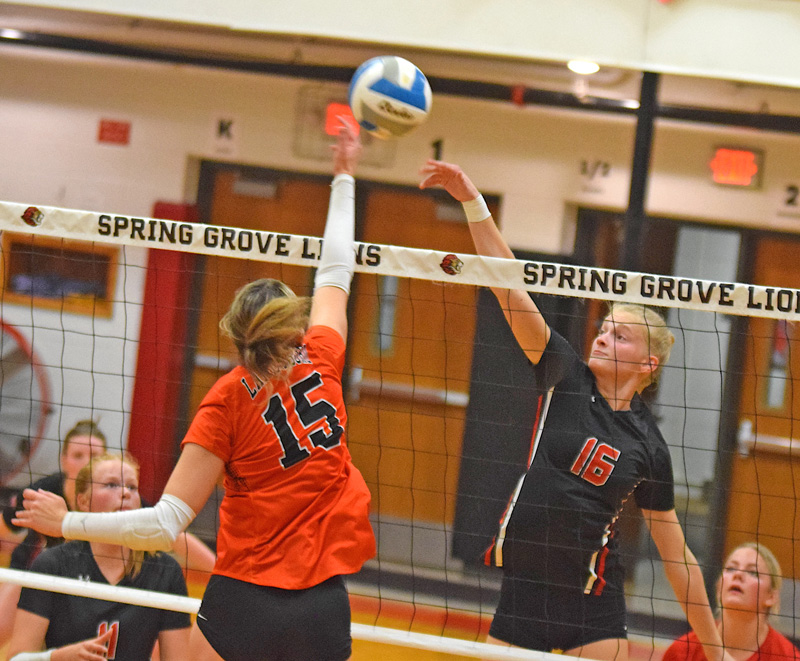 Spring Grove (11-2, 20-7) claimed a 20th win for the fourth straight season with a 3-0 home victory over Lanesboro followed by taking three of four matches for a runner-up finish at the Goodhue Tournament. In the tourney championship match, Kendal VanMinsel became the first Lion netter to achieve 2,000 set assists. The win over the third-place Burros assured SG’s fourth consecutive outright runner-up finish in the SEC-East. For a second time this season, the Lions swept Lanesboro, this time 25-22, 25-11, 25-16. Both teams came in with 16 wins. SG improved to 11-2 SEC, 17-6 overall while LHS slipped to 9-4, 16-8. It was a frustrating first set for both teams, but the Lions eventually achieved some offensive rhythm. Lanesboro never did. Spring Grove attacked with 17% efficiency (35 kills, 16 misfires) while the Burros managed 15 kills with 21 hitting errors. Each team gained only one point at the service line. The Lions served 12 aces while giving away 11 points with errant serves. The Burros served five aces with four errors. Joelle Halverson had team-highs with 41% hitting efficiency and 10 kills. Jordis Neeley (39%) added 8 kills. VanMinsel supplied 26 set assists. On defense, VanMinsel and Izabel Kaufmann each had 11 digs, Halverson 10, and Sydney Holland 8. Jensyn Storhoff (4 kills, 9 assists, 13 digs) and Ava Rein (9 digs) led the Burros. In tourney action at Goodhue, the Lions won their pool with 2-0 wins over Hayfield (25-15, 25-18), Alden-Conger (25-20, 25-20) and Medford (25-20, 25-22). In the championship match, SG fell to Cleveland (28-26, 22-25, 11-15). Both Cleveland and Alden-Conger were enjoying 20-win seasons. For the day, Hailey Normann and Halverson each had 28 kills. Neeley scored with 26 kills and 6 ace serves. Holland had 51 digs, Halverson 40. Van Minsel had 88 assists, notching 71 to get to her 2,000th.